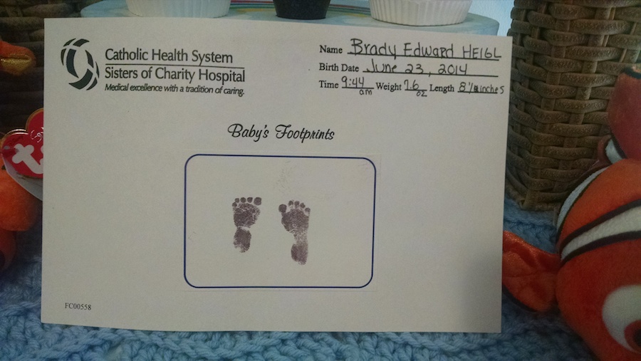 The doctors could not explain why this happened. We got all of the reports back on Brady and he was 100% healthy. My diagnosis was called PPROM. (Preterm Premature Rupture of Membranes) and it only occurs in .04% of pregnancies. Most of the causes of PPROM is from an infection, but sometimes it is just a fluke thing. In the case of myself, that is what it was.